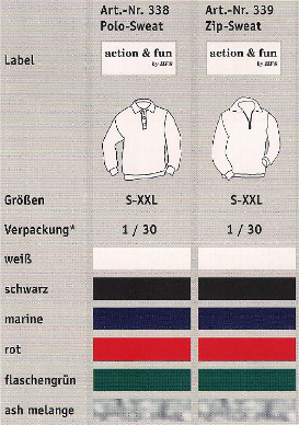 Sweat-Shirts mit Polokragen oder Zipper 310-320 g/qm • 70% Baumwolle / 30% Polyester • 3-fädige-Qualität • 310-320 g/qm • Innen aufgeraut • AZO-frei • 60 Grad waschbar • Farbecht durch Färbunq mit reaktiven Farbstoffen • Doppelnähte an Hals und Schultern • Gewebtes Heringbone Nackenband • Gewebtes Label • Äußerst wasch- und formbeständig