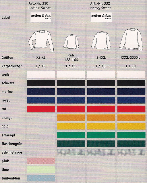 Art.-Nr. 310  Ladies' Sweat"action & fun"            • Taillierter Schnitt                                                                                                                                                                                            • Schmale Bündchen                                                                                                                                                                                        • Rund eingesetzter Arm                                                                                                                                                                                   • Feminine Passform                                                                                     Art.-Nr. 332  Heavy Sweat"action & fun"              • Unisex-Schnitt                                                                                                                                                                                                 • Gerade eingesetzter Arm                                                                                                                                                                                • Halbmond im Nacken
