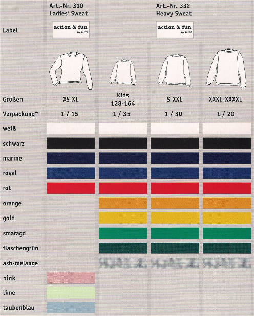 Art.-Nr. 310 Ladies' Sweat"action & fun" • Taillierter Schnitt • Schmale Bündchen • Rund eingesetzter Arm • Feminine Passform Art.-Nr. 332 Heavy Sweat"action & fun" • Unisex-Schnitt • Gerade eingesetzter Arm • Halbmond im Nacken